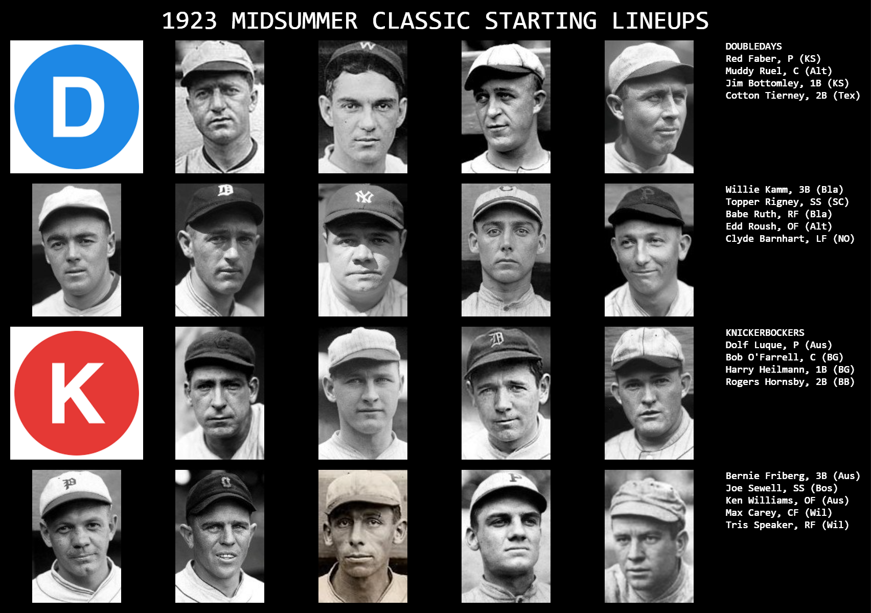 Raleigh, NC (WBSP): Today the Commissioners office announced the 1923 Midsummer Classic rosters. Both Babe Ruth and Rogers Hornsby were the only unanimous selections and are returning for their 5th consecutive time as starters. Kinnaird Street ace Red Faber will make his second consecutive start for the Doubledays, and face off against the Aces' Dolf Luque. Bob O'Farrell, Cotton Tierney, Harry Heilmann, and Tris Speaker also return as starters from last season. The Austin Aces lead all teams this season with seven players in the Midsummer Classic. Other players returning from last year's Classic include Whitey Witt, Pat Duncan, Zach Wheat, and Dolf Luque. The Old Lyme Ticks will host the game at in Old Lyme, CT. Alto's Gary McIntosh and Austin's Steve Wood will serve as managers for the Doubledays and Knickerbockers, respectively.